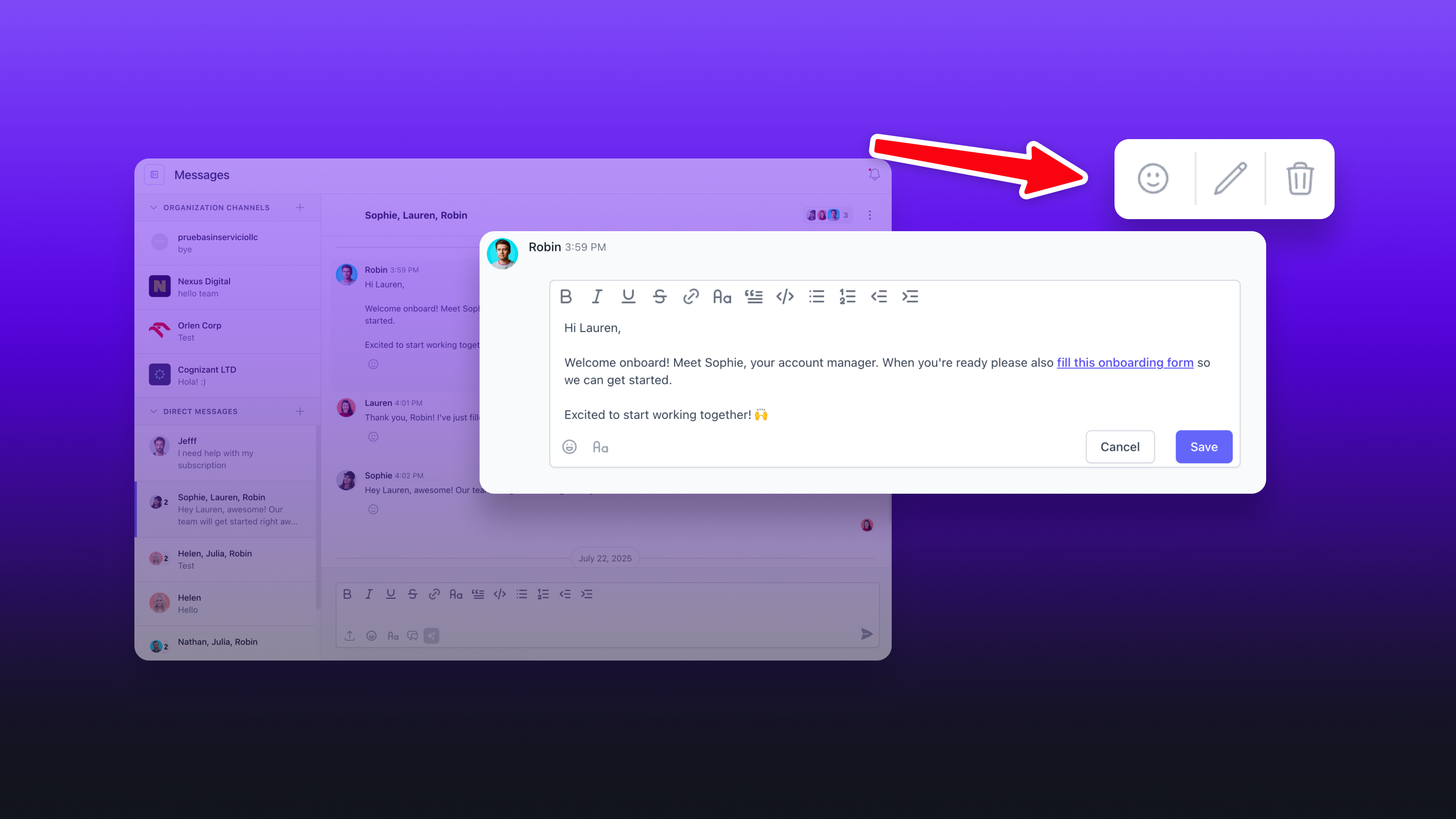 Team members can edit their own messages, while admins can edit or delete any message. This gives teams better control over communication without needing support intervention.