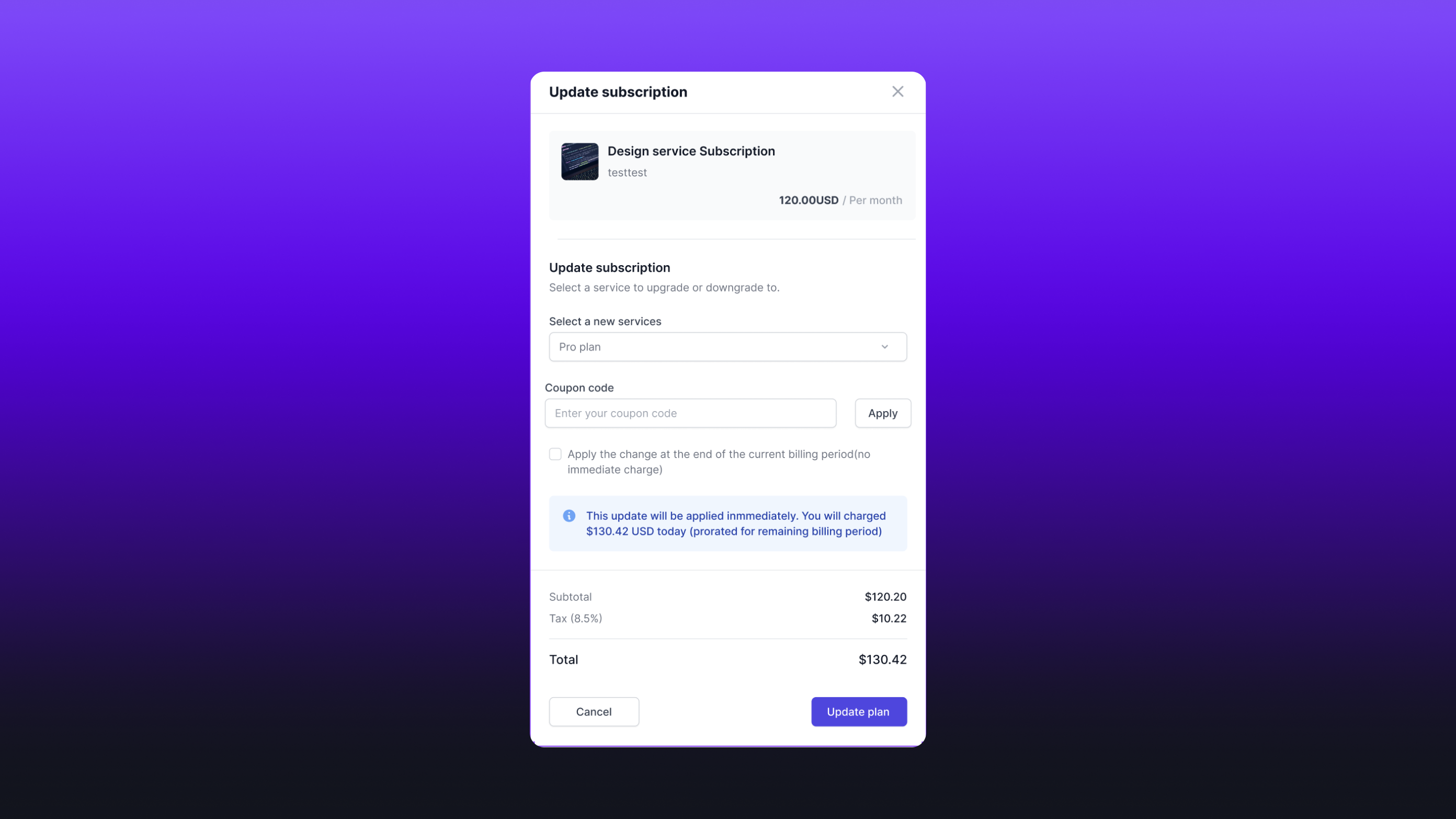 The upgrade and downgrade confirmation screen now shows a clearer breakdown of charges, including taxes, discounts, and the final amount to be billed. Clients can review all details before confirming the change.
