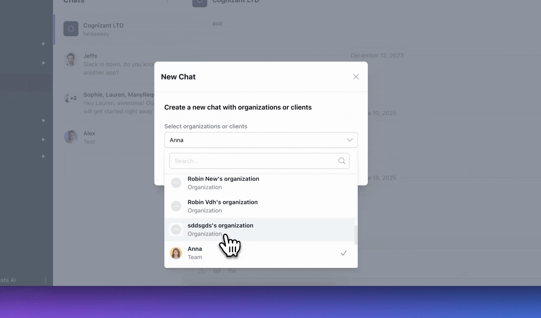 In addition to clients and organizations, chats can now be initiated with internal team members and admins. This supports more streamlined internal communication within the portal.
