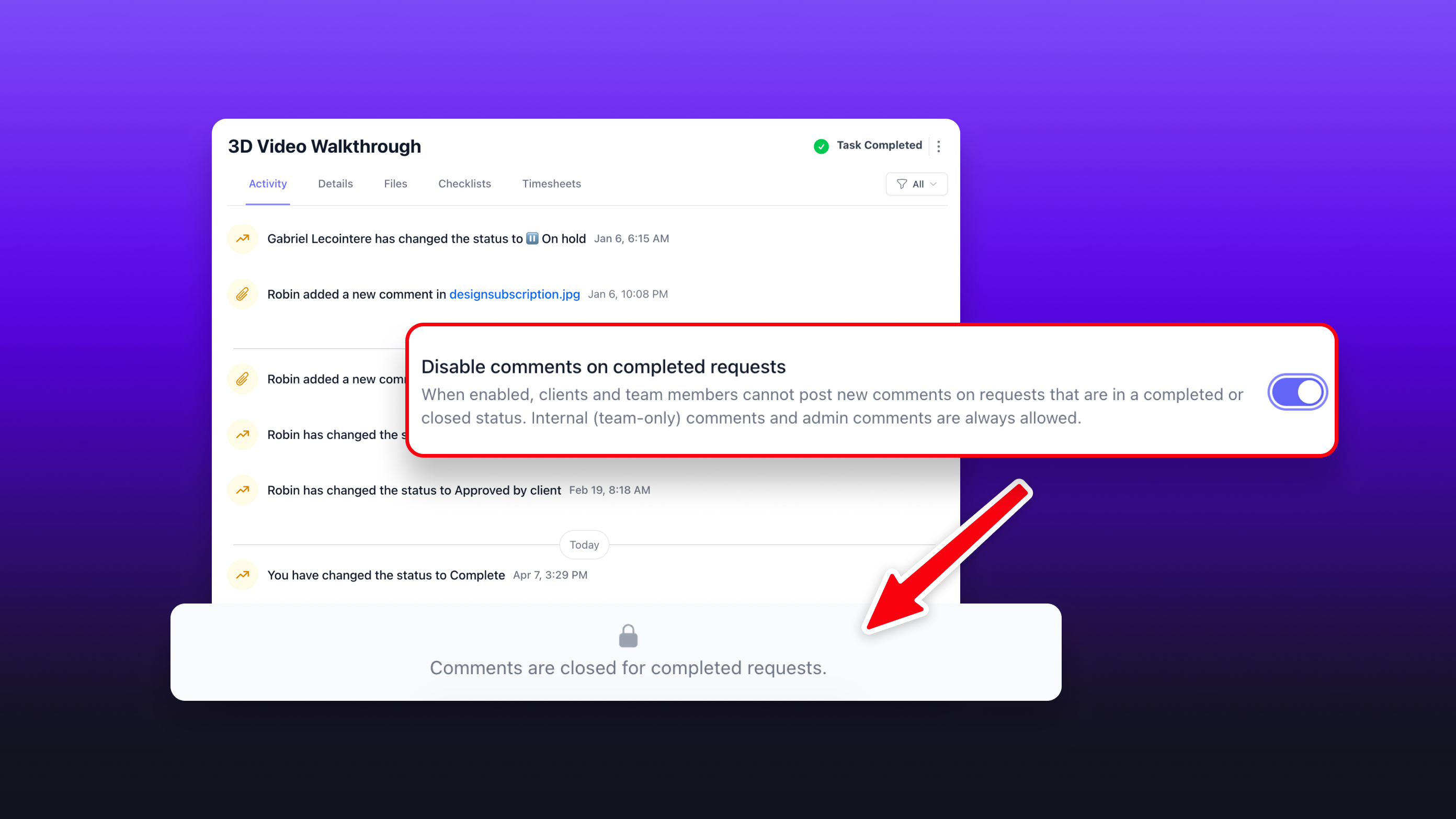You can now make completed requests read-only for clients. They can still view the conversation, but canโt add new comments, keeping finished work clean and free from accidental updates.