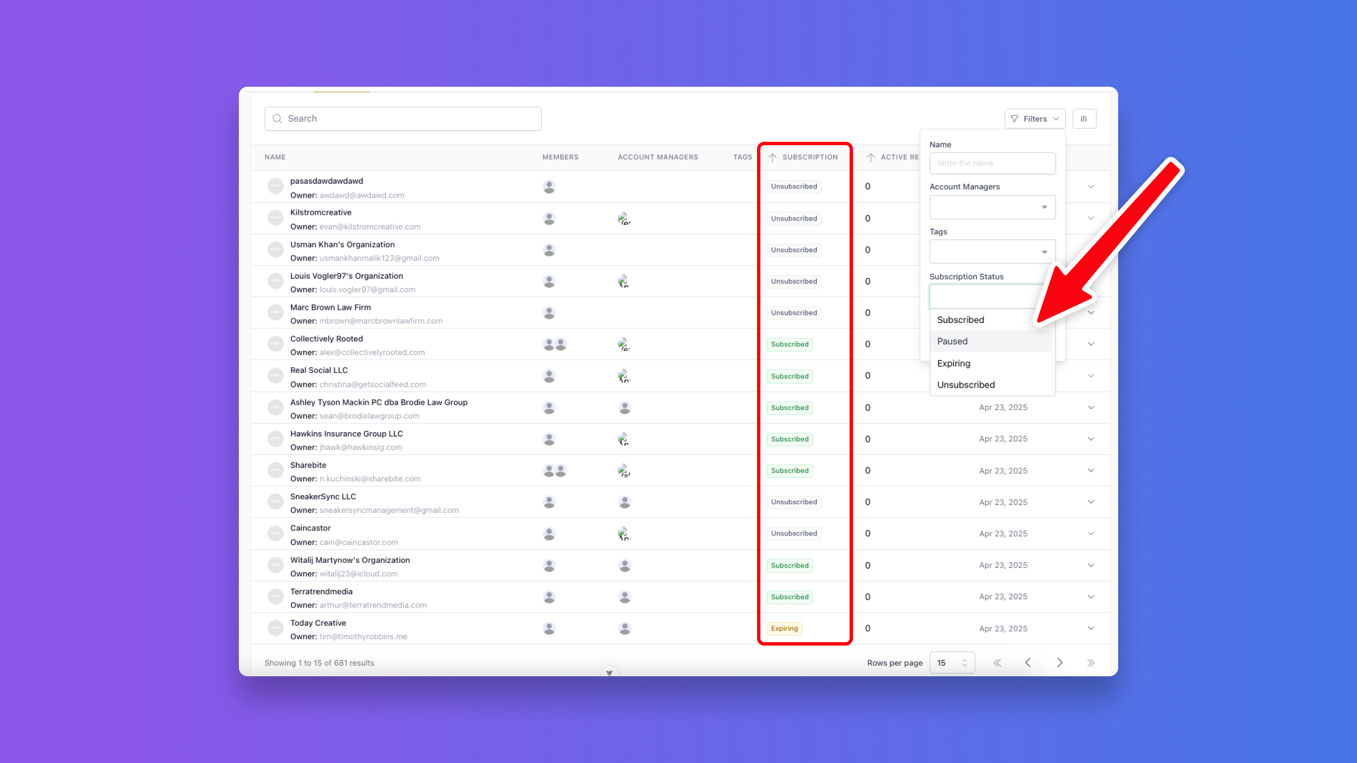 You can now filter by a specific status: Subscribed, Paused, Expiring, or Unsubscribed.