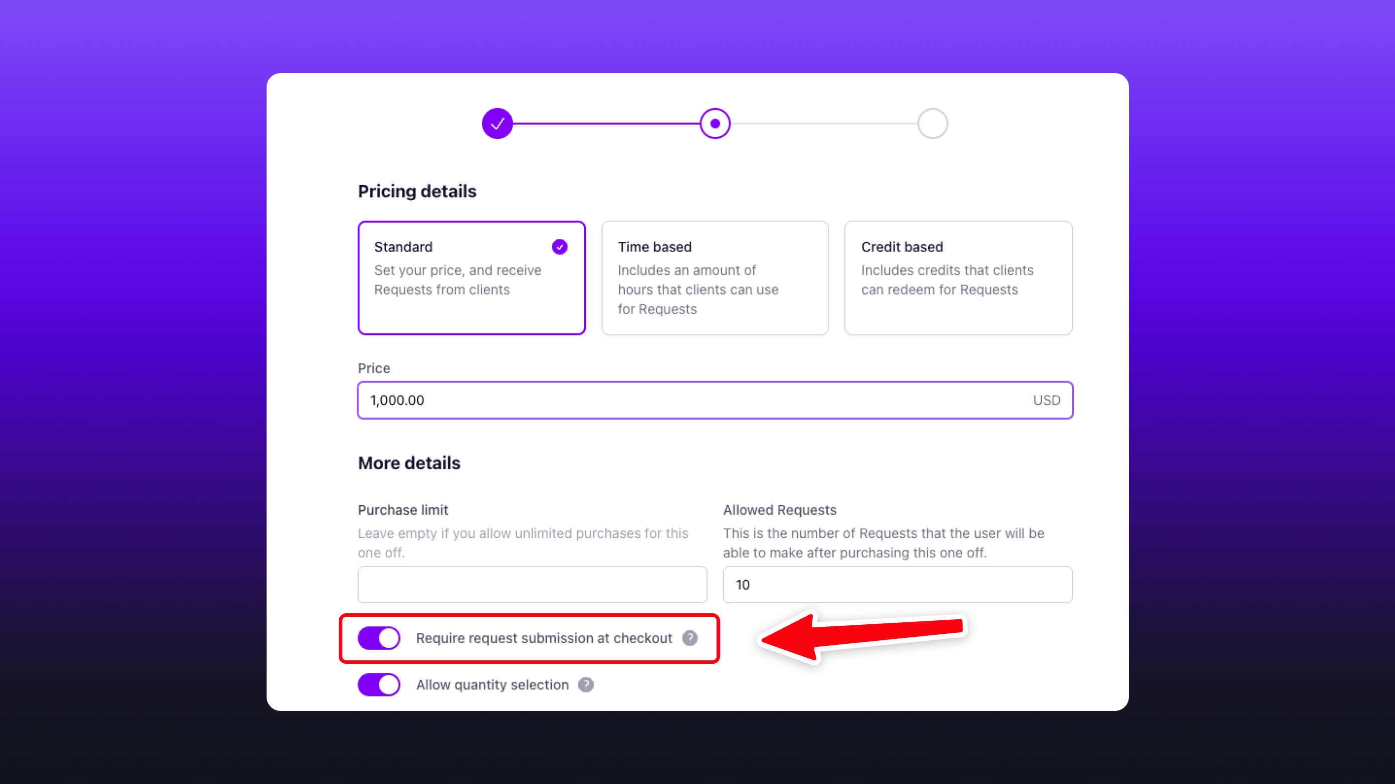 You can now allow clients to purchase one-off services without filling out the request form during checkout. They can submit the request later from their portal, making the buying process faster and less friction-heavy.