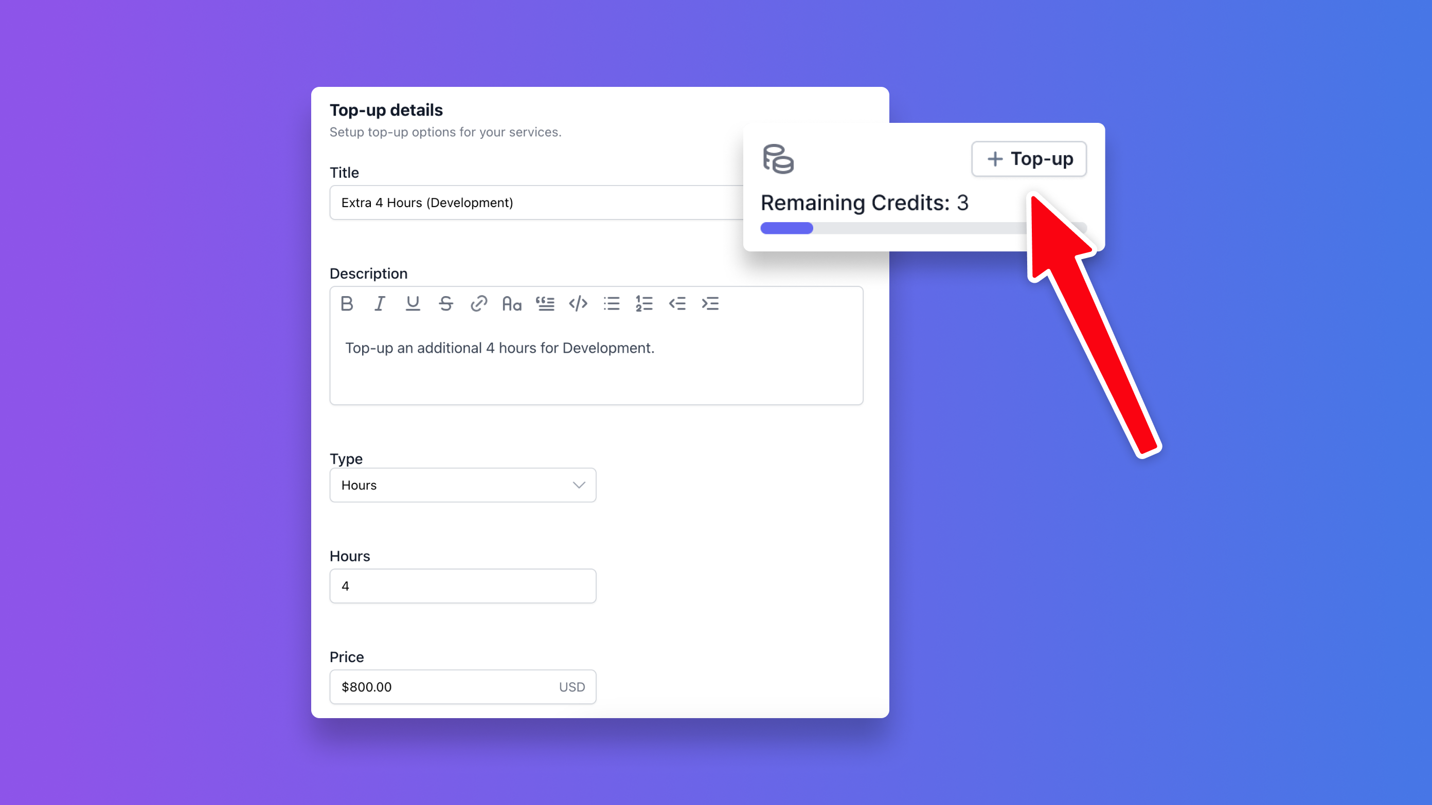 Once set, users will see a “Top-up” button in the widget to purchase additional time or credits and instantly increase their balance.